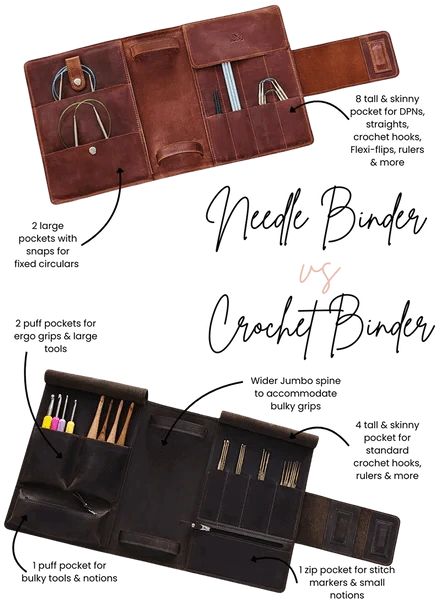 It comes in two styles - as a Knitting Needle Binder Shell or as a Crochet Binder Shell, though both can accommodate all page types.